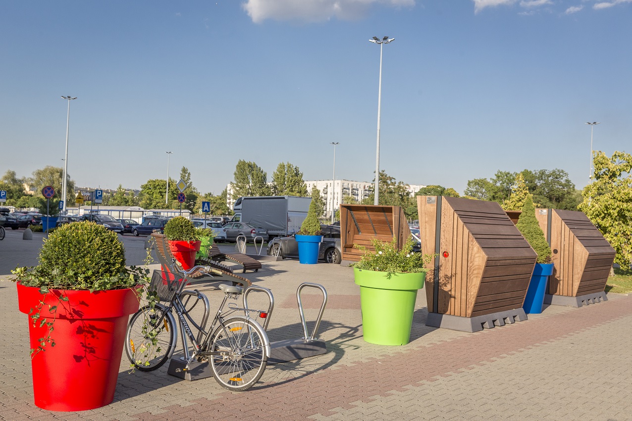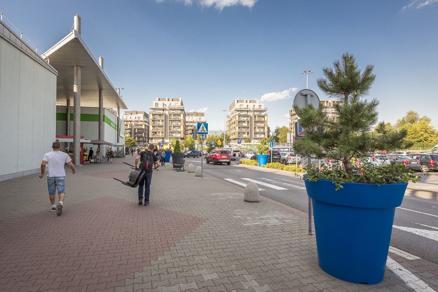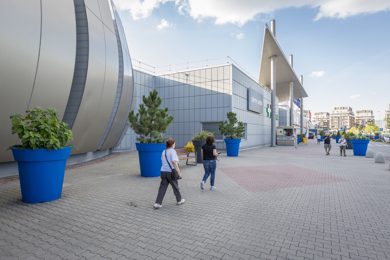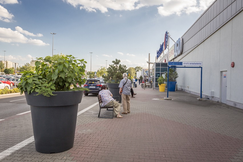 Teraz przestrzeń przed centrum handlowych zyskuje bujną zieleń. Wszystko za sprawą aż 68 donic z roślinnością, które stanęły wzdłuż budynku oraz w strefie chill out. To właśnie w nich zasadzono m.in. bukszpany wiecznozielone, sosny kosodrzewiny, sosny czarne, hortensje, karłowe świerki, a także, róże okrywowe i świdośliwy (tzw. gołębie jagody).